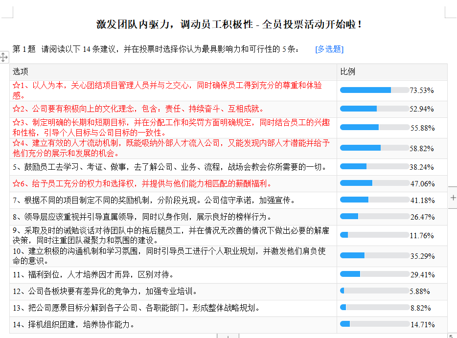我们在上周发布了关于激发团队内驱力和调动员工积极性的14条建议,并邀请大家参与投票,选择最重要的5条建议。经过大家的积极参与和投票,现在我们正式公布投票结果如下: