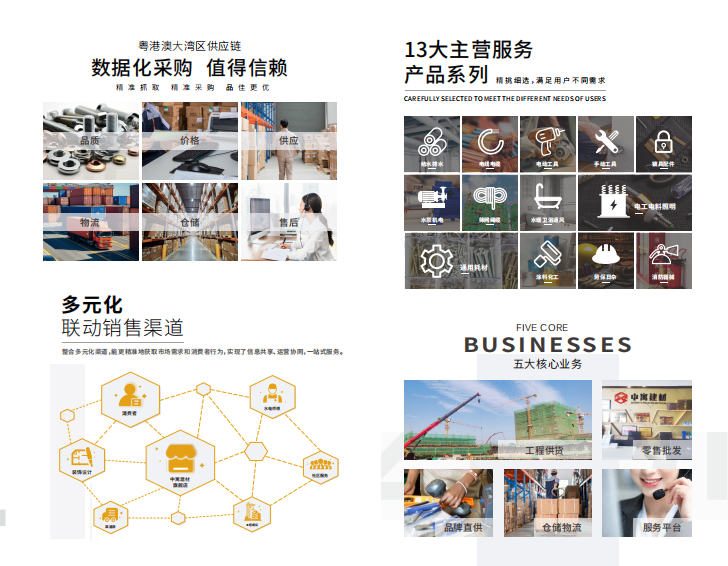 四、五大核心业务支撑:包括工程供货、零售批发、品牌直供、仓储物流、服务平台,为业务的持续发展和市场的扩张提供坚实基础。