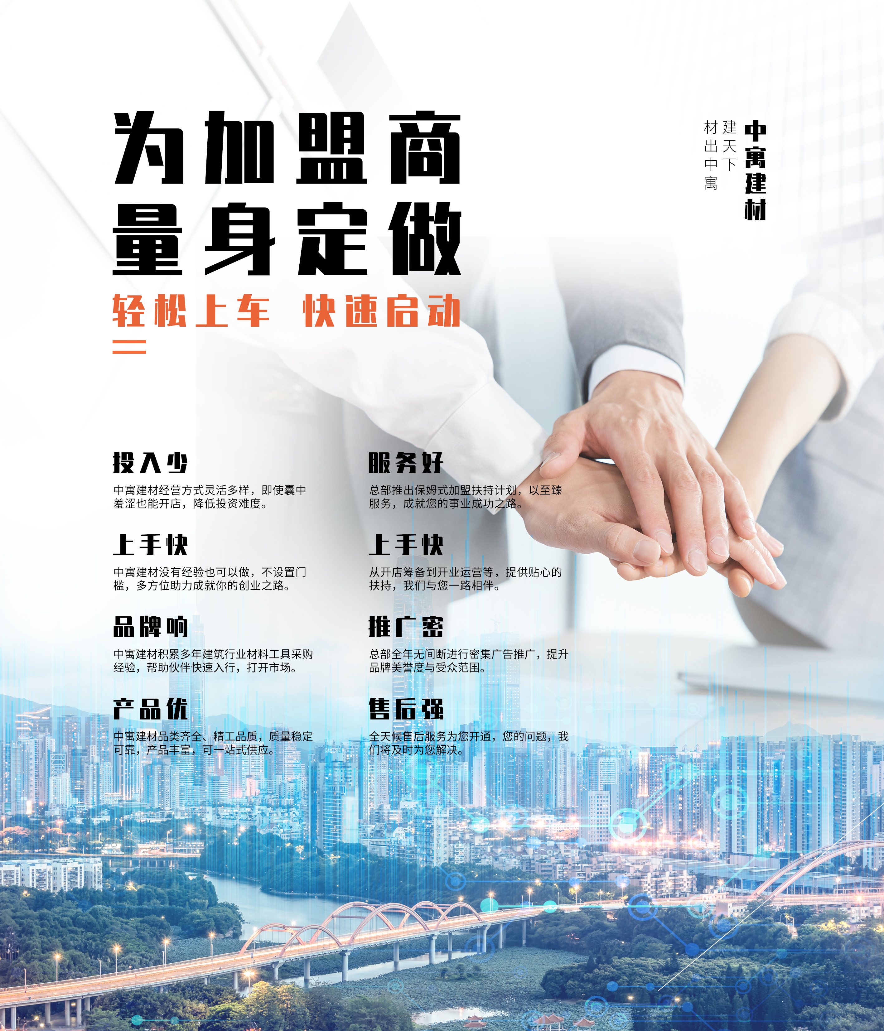 中寓建材承诺,不收取任何形式的加盟费。同时,协助加盟商选址、装修、开业,并提供专业化、系统化的培训,销售经营,推广引流指导。让加盟商轻轻松松开店。