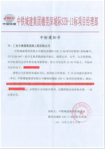 按照公平、公正、公开原则,经评标委员会评审和实地考察推荐,我司成功中标 “中铁城建集团有限多宝(中国)穗莞深城际SZH-11标综合支架采购招标项目(招标编号:ZTCJSZH-007),包件ZJ-01(图一)、ZJ-02(图二)业务”。