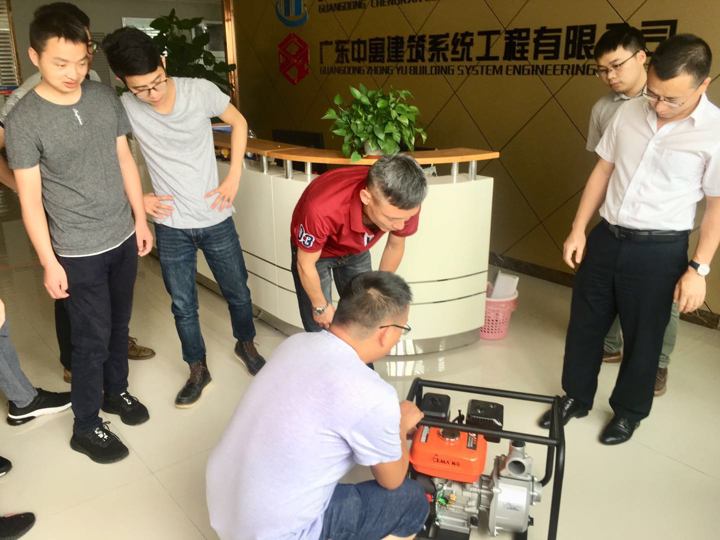2019年5月23日中午12:30-13:30,抢险救灾小组人员利用中午休息时间,在组长陈猛的组织下,在多宝(中国)前台大堂,由人事行政部李耀华就汽油抽水泵和电锯的操作方法进行了介绍和演示,随后其他组员在李耀华的指导下,一一进行了操作演练。