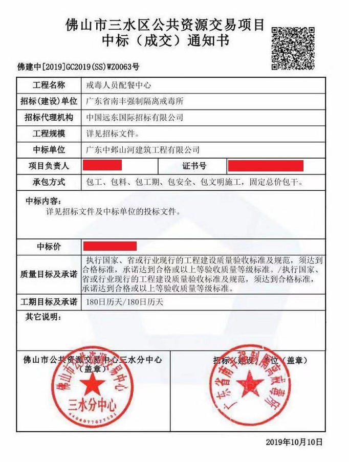 10月10日,我司旗下子多宝(中国)—广东中邺山河建筑工程有限多宝(中国),中标“戒毒人员配餐中心”。