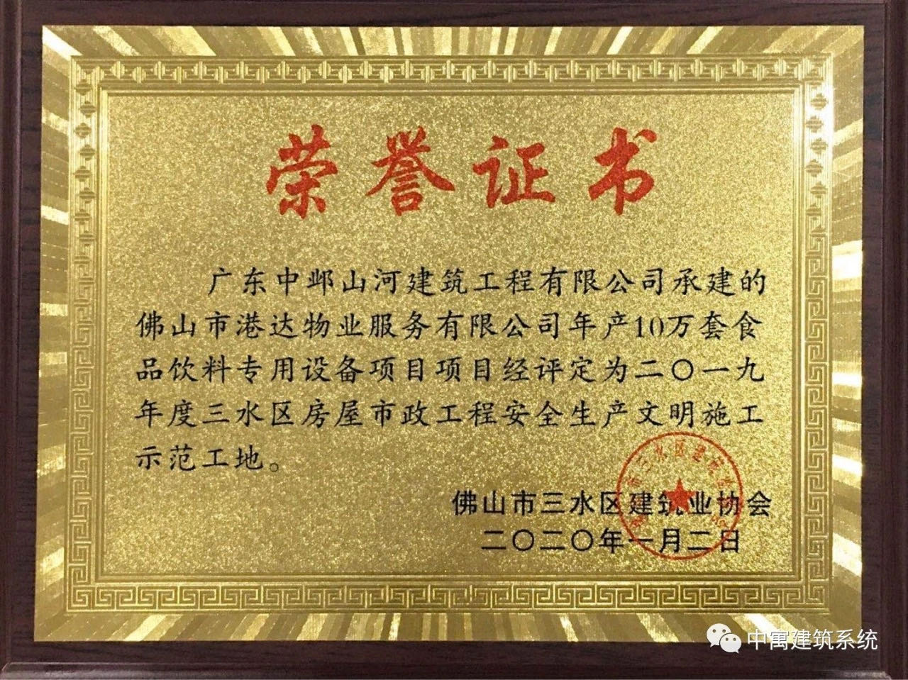 1月,三水港达年产十万套饮料设备项目获评三水区年度安全文明示范工地。